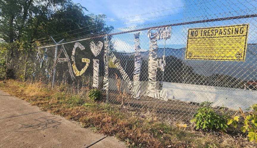 The word “Imagine” is weaved into a fence that stands outside the Roof Depot Building in Minneapolis, Minnesota. The East Phillips Neighborhood Institute has been attempting to buy the building from the city of Minneapolis since 2014. Photo by Carina Dieringer, October 18, 2025